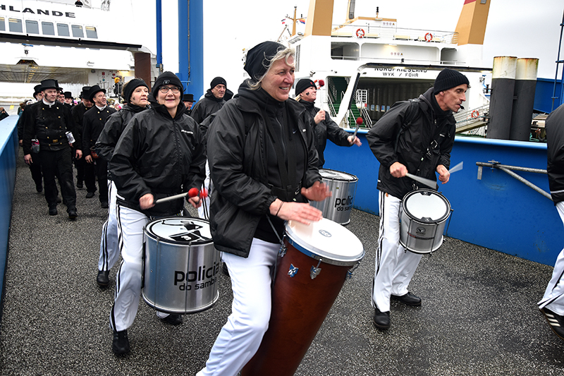 Gott sei Dank musste Silvester der Fährverkehr von morgens bis gegen den Nachmittag noch nicht eingeschränkt werden. So konnten die Schornsteinfeger aus Nordfriesland wieder nach Wyk auf Föhr kommen, um Glück zu wünschen fürs neue Jahr und wieder Geld zu sammeln für den guten Zweck. Seit 2009 steht diese Aktion im Zeichen des Wilhelminen-Hospizes in Niebüll. Mit dabei war auch wieder »Policia do Samba«, die Sambagruppe aus Flensburg. Bereits auf der Fähre hatte sie die Fahrgäste mit ihren mitreißenden Rhythmen begeistert. An Land war das nicht anders.