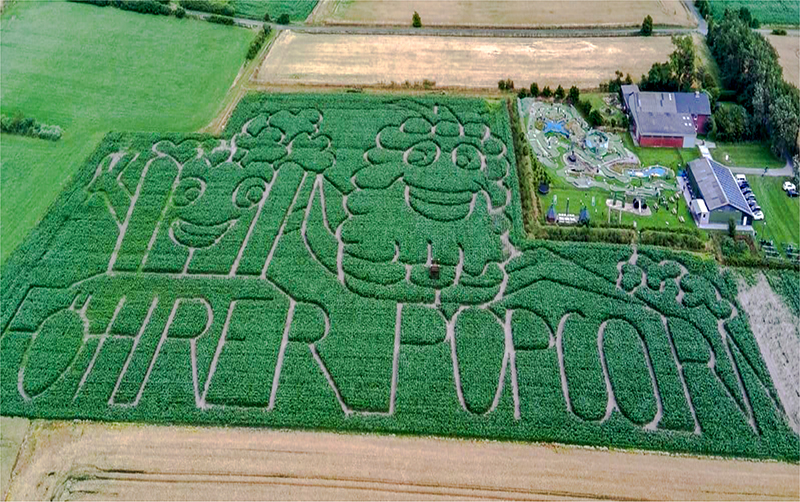 2003 waren sie zum ersten Mal angelegt worden, die 3,1 Kilometer langen Irrwege im knapp vier Hektar großen Föhrer Maislabyrinth beim Adventure-Golf-Platz in Borgsum-Feld. Mittlerweile ist es das 23. Bild, nach dem sie ausgefräst wurden. Oft hatten die Motive einen Bezug zu Borgsum und zur Insel. Dieses Mal sind es zwei lustige Maiskolben und der Schriftzug Föhrer Popcorn. Denn auf einem kleinen Feld neben dem Maislabyrinth wurde vergangenes Jahr erstmals Popcorn-Mais angebaut. Und dieser ist nun in Gläsern und Tüten erhältlich. Oder man kann ihn frisch gepoppt direkt genießen.