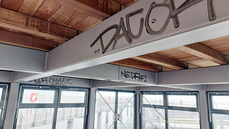 Was ist bloß in Wyk los? Schockierende Bilder, wohin man schaut, so in der Preessemitteilung. Nachdem Anfang Juni die neu aufgebaute Südstrandbrücke Opfer übler Schmierereien wurde, wurden jetzt innerhalb weniger Tage in Wyk mehrere Orte verunstaltet.
