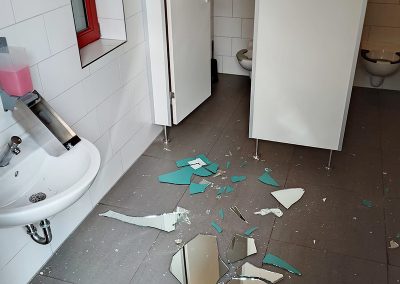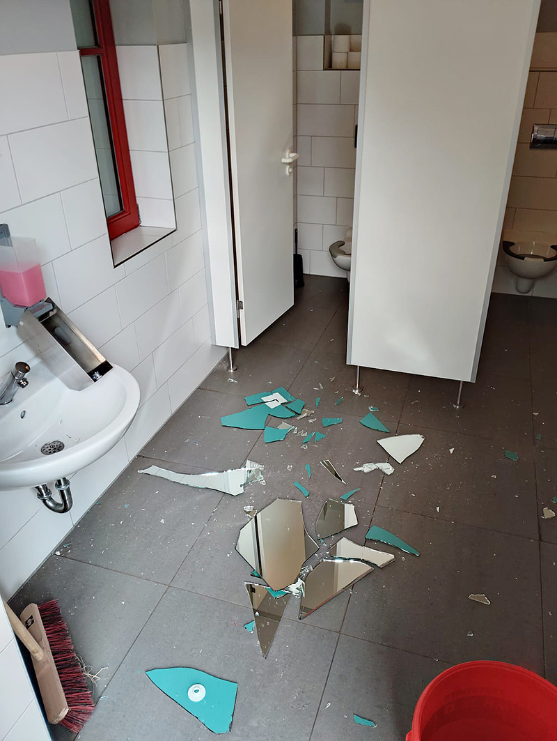 Schon am nächsten Tag im Toilettengebäude an der Löwenhöhle: Vandalismus pur. Direkt am Spielplatz, wo tagtäglich Kleinkinder behütet spielen, regiert plötzlich wilde Zerstörungswut. Ein Spiegel wird von der Wand gerissen und auf dem gekachelten Boden zerschmettert, ein Seifenspender wird ebenfalls zerstört.