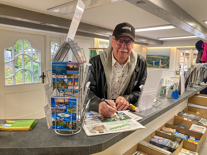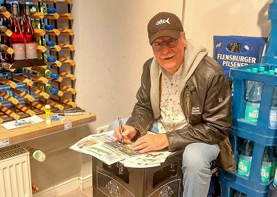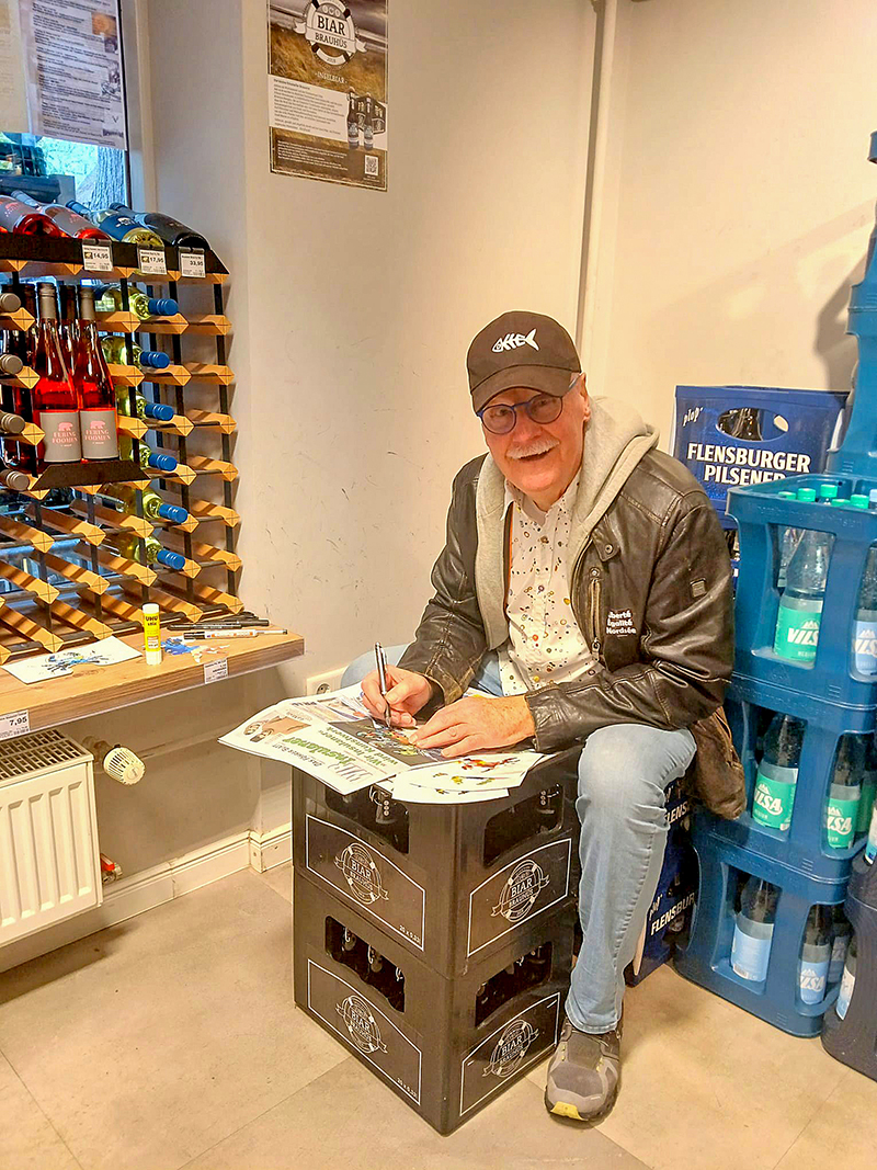 In diesem Rahmen sollte auch »WIR Insulaner« ein Kunstwerk werden. Jedenfalls 25 nummerierte Exemplare, die von PAN signiert, überarbeitet, nachkoloriert und beklebt werden sollten. Die ersten Arbeiten sind verteilt. Mit seinem mobilen Atelier »Kunsteins« hatte Petzold kurzfristig beim Frischemarkt Hückstädt, in der Bäckerei Hansen und der Gemeindeverwaltung im Dörpshus in Nieblum Station gemacht, um »WIR Insulaner« künstlerisch zu bearbeiten und den bereits ausgelegten Exemplaren heimlich wieder beizulegen. Mal sehen, was passiert.