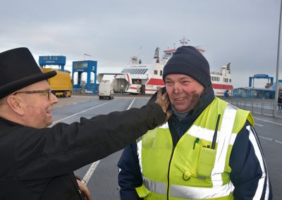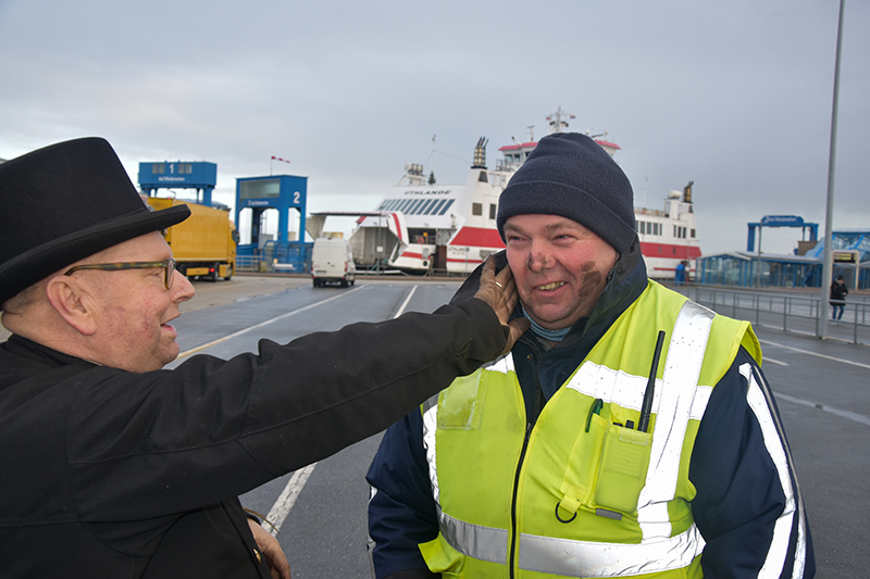 Sambagruppe und Schornsteinfeger kommen von Bord und werden sofort umlagert.
