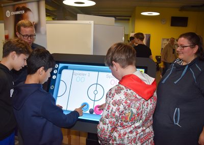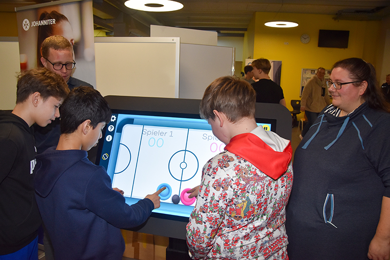 Die Vorstellung der Berufe erfolgte nicht nur auf theoretischer Basis. Konnte beim Tischler ein Nagel mit einem Hammer in einen Balken geschlagen und beim Maler einmal ein Pinsel mit Farbe gehändelt werden, zog das Care Table vom Johanniter-Haus Wyk auf Föhr die Schülerinnen und Schüler magisch an. Denn die Bewohnerinnen und Bewohner in dem Seniorenzentrum können über diese Technik nicht nur Zeitung lesen und die Mediathek von ARD und ZDF aufrufen, sondern virtuell Klavier spielen, Malen und beispielsweise »Mensch ärgere nicht« und Schach spielen. Sogar ein Quiz könne veranstaltet werden mit dem digitalen Aktivitätstisch, der eine große Hilfe in der täglichen Arbeit bedeute, erklärte Beschäftigungsassistentin Marie Hinrichsen.