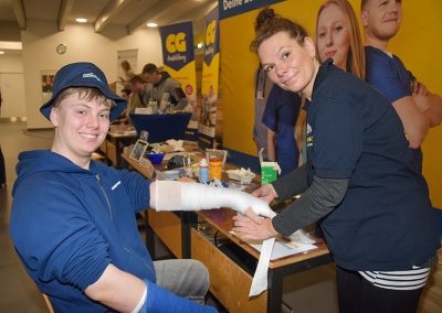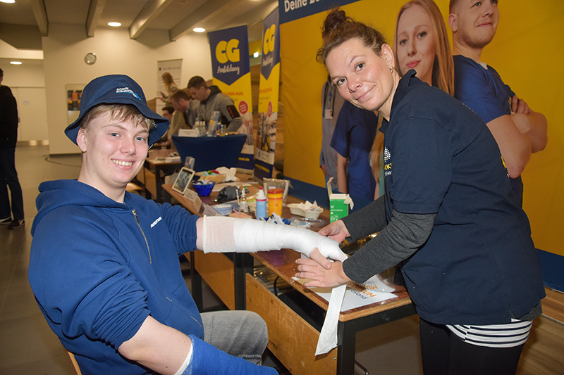 Außer vielleicht in der Lagerlogistik, werden beim Baustoffhandel C.G. Christiansen und für den »Hagebaumarkt« zurzeit keine Auszubildenden gesucht. Am Tag des Berufs war Torben Jacobs, Standortleiter Fachhandel, trotzdem mit einem Team vertreten, um die Berufe in diesem Unternehmen vorzustellen. »Nachwuchsarbeit sei immer wichtig, zumal in allen Bereichen die Möglichkeit eines Praktikums besteht«, berichtete er – ob in den kaufmännischen Berufen, als Lagerist oder Einzelhandelskaufmann und im Großhandelsmanagement. Praktika werden ebenfalls immer im Handwerk angeboten und auch vom Praktikumsverbund Gesundheit und Soziales, zu dem sich der AWO-Kindergarten, »Ambulantes Pflegeteam«, das Klinikum Nordfriesland und das Paritätische Haus Schöneberg zusammengeschlossen haben. Bei den »Schönebergern« konnten die jungen Leute einmal ausprobieren, wie ein Schwerstbehinderter mittels eines Lifters aus einer Pflegewanne in einen Rollstuhl gehoben wird. Wer wollte, konnte sich danach am Stand des Klinikums Nordfriesland einen Arm eingipsen lassen.