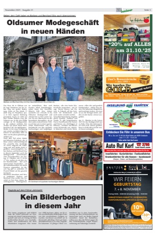 November 2025 %u00b7 Ausgabe 21Seite 3*Ausgenommen sind Dienstleistungen, Kaufgutscheine, sowie Auftr%u00e4ge aus dem Objektbereich. Gilt nur f%u00fcr Neuauftr%u00e4ge im Aktionszeitraum. Nicht mit anderen Rabattaktionen wie z.B. Easy-Shades-Kollektion oder Sunlight-Kollektion kombinierbar. **10% Rabatt (3% KnutzenPlus + 7%) nur f%u00fcr KnutzenPlus-Kunden. Verwaltung: Gutenbergstr. 12, 24941 FlensburgWIR FEIERNGEBURTSTAG7. + 8. NOVEMBERGEBURTSTAGS-RABATTE |GEWINNSPIELVORF%u00dcHRUNGEN |SPEISEN & GETR%u00c4NKEFreitag 10:00 %u2013 18:00 Uhr & Samstag 10:00 %u2013 15:00 UhrUnsere Filiale in Nieb%u00fcll feiert mit!Alle Rabatte gibt es nat%u00fcrlich auch im Ostring 4 in Nieb%u00fcll+10%f%u00fcr KnutzenPlusKunden**+10f%u00fcr KnutzenPlus10% AUF ALLES!*elektro service f%u00f6hrKohharder Weg 6 | 25938 Wyk auf F%u00f6hrGAuto oder Bus, nah oder fern. Wir sind 24 Stunden f%u00fcr Sie da.Entdecken Sie F%u00f6hr in unserem BusMi. u. Sa. um 13.00 Uhr Wyk/Hafen am WDR-Geb%u00e4udevom 1.11.25 - 13.03.26Infos unter taxi-korf.comAuto Ruf KorfClassic/PremiumTaxi oder Bus, nah oder fern. Wir sind 24 Stunden f%u00fcr Sie da.Zwischen-StopHedehusumAbfahrtAnkunftNieblumtaxi-korf.comInselfahrten %u00b7 Kurierfahrten %u00b7 FestlandfahrtenKrankenfahrten f%u00fcr alle Kassen %u2013 bundesweit(Dialyse-, Chemo- und Bestrahlungsfahrten)Inselfahrten %u00b7 Kurierfahrten %u00b7 FestlandfahrtenKrankenfahrten f%u00fcr alle Kassen %u2013 bundesweit(Dialyse-, Chemo- und Bestrahlungsfahrten)Auto oder Bus, nah oder fern. Wir sind 24 Stunden f%u00fcr Sie da.Entdecken Sie F%u00f6hr in unserem 15.3. - 31.10.25 um 10.45 Uhr und 13.00 Uhr Fahrpreise f%u00fcr Saison 2025Bus : Erw. 11,-%u20ac Kind (4-14 J.) 4,-%u20ac %u00b7 Familie (2 Erw. + max. 3 Kinder) 26,-%u20acInfos unter taxi-korf.comAuto Ruf KorfClassic/PremiumTaxi oder Bus, nah oder fern. Wir sind 24 Stunden f%u00fcr Sie da.Zwischen-StopHedehusumAbfahrtAnkunftNieblumtaxi-korf.comTaxi oder Bus, nah oder fern. Wir sind 24 Stunden f%u00fcr Sie da.Zwischen-StopHedehusumAbfahrtAnkunftNieblumUwe Petersen %u00b7 Gro%u00dfe Stra%u00dfe 28 %u00b7 Wyk auf F%u00f6hrTel. 04681 - 741 22 87 %u00b7 E-Mail: uwebernstein@aol.comwww.uwebernstein.deBargeld sofort!Wir kaufen Ihr Oldsum, Haus 86Montag Freitag11:30 18 Uhr *20% auf ALLESam 31.10.%u201825zieht alle an!Neben dem Caf%u00e9 haben es Barbara und Bernhard Gloy auch %u00fcbernommen:Oldsumer Modegesch%u00e4ft in neuen H%u00e4ndenDas Haus 86 in Oldsum war f%u00fcr Inge Haferkorn fast ihr Leben lang von gro%u00dfer Bedeutung. Hatte sie ihre Mode 15 Jahre lang im Haupthaus quasi in ihrer eigenen Wohnung pr%u00e4sentiert, baute sie 1994 mit ihrer Tochter Barbara Gloy die Scheune aus. In die eine H%u00e4lfte verlegte sie ihr Modegesch%u00e4ft, in der anderen er%u00f6ffnete ihre Tochter mit ihrem Mann Bernhard das Caf%u00e9 %u00bbIm Apfelgarten%u00ab. Beides ist mit etwas Versp%u00e4tung nun vereint, nachdem Inge Haferkorn im Dezember 2023 im Alter von 86 Jahren pl%u00f6tzlich gestorben war. Nach dem Tod seiner Mutter trat Sebastian Haferkorn, der in Bonn seinen Lebensmittelpunkt hat, zun%u00e4chst ihre Nachfolge an. Doch aufgrund der Entfernung und weil beides doch irgendwie zusammengeh%u00f6rt, haben Barbara und Bernhard Gloy in diesem September auch das Modegesch%u00e4ft %u00fcbernommen. Zum Saisonabschluss am Freitag, 31. Oktober, von 11.30 bis 17 Uhr, wollen sie mit den vielen Stammkunden %u2013 aber auch interessierten Neukunden %u2013 auf die Laden%u00fcbernahme mit einem Prosecco angesto%u00dfen. An diesem Tag gibt es au%u00dferdem 20 Prozent Rabatt auf das gesamte Sortiment. Bew%u00e4hrtes bewahren und Neues entdecken: Barbara und Bernhard Gloy wollen das Gesch%u00e4ft im Sinn ihrer Mutter beziehungsweise Schwiegermutter weiterf%u00fchren. Aber auch frischen Wind hineinbringen, wobei ihnen ihre Gesch%u00e4ftsf%u00fchrerin hilft. Sina Arfsten wechselte von %u00bbClosed%u00ab in das Oldsumer Modegesch%u00e4ft und arbeitet hier in ihrer ersten Saison. Sie war %u00fcberrascht von der besonderen Atmosph%u00e4re, als sie den Laden erstmals betrat. F%u00fchlte sich hier wie in einem gem%u00fctlichen Wohnzimmer und war beeindruckt von den qualitativ hochwertigen und langlebigen Marken, %u00bbdie eine breite K%u00e4uferschicht ansprechen%u00ab, wie sie sagt, Herren ebenso wie Damen. In Zukunft soll das Sortiment mit Kindermode auch noch weiter verst%u00e4rkt werden.Tats%u00e4chlich besticht das Angebot durch Qualit%u00e4t, Tradition und Trends. Es gibt beispielsweise Harris-Tweed-Jacken f%u00fcr Damen und Herren von %u00bbWellington of Bilmore%u00ab, Hemden und Blusen sowie Strickmode von %u00bbMaerz%u00ab in M%u00fcnchen und irische Strickwaren. %u00bbAlles chic und sportlich kombinierbar%u00ab, erkl%u00e4rt Sina Arfsten. Die bekannten Ringelshirts und maritimen Jacken, wie man sie aus der Bretagne kennt, werden von der Marke %u00bbArmor Lux%u00ab gef%u00fchrt.Am 31. Oktober ist die Saison 2025 f%u00fcr das Modegesch%u00e4ft nun zu Ende. %u00dcber den Jahreswechsel wird noch einmal ge%u00f6ffnet, bevor es Ende M%u00e4rz mit der neuen Saison weitergeht.Ein Sortiment mit qualitativ hochwertigen MarkenBarbara und Bernhard Gloy mit ihrer Gesch%u00e4ftsf%u00fchrerin Sina Arfsten (li.)Trag%u00f6die auf dem F%u00f6hrer Jahrmarkt:Kein Bilderbogen in diesem JahrWie immer ausgelassen und fr%u00f6hlich hatte der F%u00f6hrer Jahrmarkt am Donnerstag mit einem Laternenumzug begonnen und sich am Freitag mit dem traditionellen Besuch von Gesch%u00e4ftsleuten und Handwerkern mit ihren Mitarbeitern fortgesetzt. Wie immer war %u00bbWIR Insulaner%u00ab dabei, um f%u00fcr einen anschlie%u00dfenden Bilderbogen Fotos von den verschiedenen Gruppen zu machen. Auf diesen verzichten wir in diesem Jahr allerdings. Denn am Sonnabendabend kam es zu einer Trag%u00f6die. Ein bekannter 35-j%u00e4hriger F%u00f6hrer Unternehmer war in einer Auseinandersetzung mit dem Sicherheitsdienst am Autoscooter noch am Boden liegend verstorben. Stand bei Redaktionsschluss war, dass di