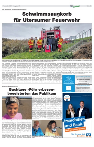 November 2025 %u00b7 Ausgabe 21Seite 5immobilien-vvrbk.deImmobilien und Bank.Weil wir beides k%u00f6nnen.Lassen Sie uns sprechen04681 500 3602025_FAB-I_Anzeige_WI_95x142_v1.indd 125.09.25 15:5Von heimischen Unternehmen erm%u00f6glicht:Schwimmsaugkorb f%u00fcr Utersumer FeuerwehrDie Freiwillige Feuerwehr Utersum-Dunsum-Hedehusum kann sich %u00fcber eine wichtige Neuanschaffung freuen: Dank gro%u00dfz%u00fcgiger Spenden heimischer Gesch%u00e4ftsleute wurde ein Schwimmsaugkorb beschafft %u2013 ein Ger%u00e4t, das bei Brandeins%u00e4tzen und Hochwasserlagen k%u00fcnftig entscheidend zur Wasserentnahme beitragen wird. Der %u00bbAmphibio%u00ab ist ein schwimmender Saugtrichter, der konzipiert wurde, um Wasser effizient und flexibel zu f%u00f6rdern %u2013 etwa aus Teichen, flachen B%u00e4chen oder Gr%u00e4ben. Dabei bietet er mehrere Vorteile: Der Schwimmsaugkorb kann Wasser schon aus nur 1,5 bis 2 Zentimetern Wassertiefe ansaugen. Dadurch bleiben Schweb- und Bodenteilchen drau%u00dfen %u2013 ideal, um ein Verstopfen der Pumpe zu vermeiden. Durch diese Eigenschaft wird der Einsatz bei der Wasserentnahme aus schwierigen oder unzug%u00e4nglichen Quellen deutlich erleichtert.Nachdem der Bedarf erkannt worden war, startete Ger%u00e4tewart Andreas Brodersen eine Spendenaktion. Mehrere Unternehmer und Gesch%u00e4ftsinhaber aus der Region erkl%u00e4rten sich bereit, den Gro%u00dfteil der Kosten zu %u00fcbernehmen. Unter anderem beteiligten sich: Das Restaurant %u00bbHennigs%u00ab im Hotel %u00bbWaastwinj%u00ab, das Hotel garni %u00bbZur Post%u00ab, der Frischemarkt Nissen, der Wohnmobilstellplatz Utersum, %u00bbHinrichsen%u00b4s Farm Destillery%u00ab, %u00bbF%u00f6hrer Party Service%u00ab und Fahrradverleih Paula Hansen.Durch diese Unterst%u00fctzung konnte der Kostenrahmen gedeckt werden, ohne dass die Gemeindekasse belastet werden musste. Mit dem neuen Schwimmsaugkorb verbessert sich die Einsatzf%u00e4higkeit der Feuerwehr in mehreren Punkten: Das Wasser kann schneller angesaugt werden, auch aus flachen Gew%u00e4ssern oder bei niedrigem Pegelstand (Effizienz). Eins%u00e4tze, bei denen es bislang schwierig war, ausreichend Wasser zum Beispiel in Entw%u00e4sserungsgr%u00e4ben zu beschaffen, werden erleichtert (Flexibilit%u00e4t). Durch das Verhindern von Schweb- oder Sedimentaufnahme wird die verwendete Pumpentechnik au%u00dferdem geschont und der Instandhaltungsaufwand reduziert. Die Feuerwehr Utersum plant, den neuen Schwimmsaugkorb bei kommenden %u00dcbungen einzusetzen, damit alle Einsatzkr%u00e4fte mit Ger%u00e4t und Funktionalit%u00e4ten vertraut sind. Zudem soll er ab sofort bei Eins%u00e4tzen genutzt werden, sobald er strategisch sinnvoll positioniert werden kann. Die Gemeindewehrf%u00fchrer Dennis Fehr und Karsten Rosteck zeigten sich sichtlich erleichtert: %u00bbDank der Unterst%u00fctzung unserer Unternehmer sind wir nun f%u00fcr gewisse Situationen deutlich besser ger%u00fcstet. Nicht zuletzt ist es sch%u00f6n zu sehen, wie viel Bereitschaft in unserer Dorfgemeinschaft herrscht, wenn%u2019s drauf ankommt.%u00abWehrf%u00fchrer Dennis Fehr, S%u00f6nke S%u00f6rensen vom Stellplatz f%u00fcr Wohnmobile, Ger%u00e4tewart Andreas Brodersen (auch %u00bbPartyservice F%u00f6hr%u00ab), Jan-Hauke Hinrichsen vom Wohnmobilstellplatz, Tim Hennig vom Hotel %u00bbWaastwinj%u00ab , Wolfgang Hennig vom Hotel garni %u00bbZur Post%u00ab und Karsten Rosteck von der Wehrf%u00fchrung mit Jonne (v.li.)Einfach mal UrlaubFerienvermietung Nordsee-Insel F%u00f6hr und deutschlandweitDigitale VisitenkarteEINFACH MAL URLAUBFerienunterk%u00fcnfte f%u00fcr Jedermannvon preiswert und komfortabelbis Premium HyggeIhr Urlaubsspezialist vor OrtFREIE KAPAZIT%u00c4TENAuf Ihre W%u00fcnsche zugeschnitten:M%u00fclltonnen-Service, Garten etc.zuverl%u00e4ssig - modern - kompetentMit einem Besucherrekord:Buchtage %u00bbF%u00f6hr erLesen%u00ab begeisterten das PublikumMit einem Besucherrekord von rund 2.300 Literaturbegeisterten endeten die f%u00fcnften F%u00f6hrer Buchtage. Den feierlichen Schlusspunkt setzte eine eindrucksvolle szenische Lesung der Schauspieler Sebastian Str%u00f6bel und Stefan Szasz, die in Kooperation mit dem Team der Wyker Nationalparkhalle und der Hospizinitiative F%u00f6hr Amrum organisiert wurde. %u00bbF%u00f6hr erLesen%u00ab sei l%u00e4ngst zu einer Gemeinschaftsleistung vieler geworden %u2013 es sei ein lebendiger Ort, der Begegnung, der Menschen, Geschichten und Natur verbinde, betonen Helge Lauenburg und Simone Welzien vom Vorstand des veranstaltenden, gemeinn%u00fctzigen Vereins. Neben Auftritten renommierter Autorinnen und Autoren standen auch die Beitr%u00e4ge von Menschen auf der Insel im Mittelpunkt.Die 262 Einsendungen zum Lyrikpreis sowie 36 Geschichten F%u00f6hrer Grundschulkinder zeigten eindrucksvoll, wie vielf%u00e4ltig und fantasievoll das Festivalmotto %u00bbSturm und Stille%u00ab aufgegriffen wurde. Den F%u00f6hrer Lyrikpreis gewann die M%u00fcnchnerin Caroline Kaum mit ihrem Gedicht %u00bbVielleicht!%u00ab und den Geschichtenwettbewerb f%u00fcr F%u00f6hrer Grundschulkinder die Wyker Sch%u00fclerin Emma Winger.Auch das Wetter f%u00fcgte sich lebendig in das Programm ein: So konnten die Besucherinnen und Besucher auf der neuen Mittelbr%u00fccke in einer gl%u00e4sernen Kabine eine Lesung mitten im Sturm erleben, w%u00e4hrend im Garten des Dr. Carl-H%u00e4berlin-FriesenMuseums beim Yoga die Ruhe und Gelassenheit der Stille sp%u00fcrbar wurde.Zum gro%u00dfen Erfolg des Festivals trugen zahlreiche Partner bei %u2013 allen voran die F%u00f6hr Tourismus GmbH (FTG) und die Kurverwaltung Nieblum. %u00bbWir gratulieren dem Organisationsteam zu erneut erfolgreichen Buchtagen. Der neue Besucherrekord unterstreicht die gro%u00dfe Reichweite und Anziehungskraft sowie die Qualit%u00e4t des Programms.\FTG-Gesch%u00e4ftsf%u00fchrer Jochen Gemeinhardt. Nach intensiven und ereignisreichen Tagen g%u00f6nnt sich das Team nun eine wohlverdiente Pause, um dann mit neuen %u2013 und wie immer ungew%u00f6hnlichen %u2013 